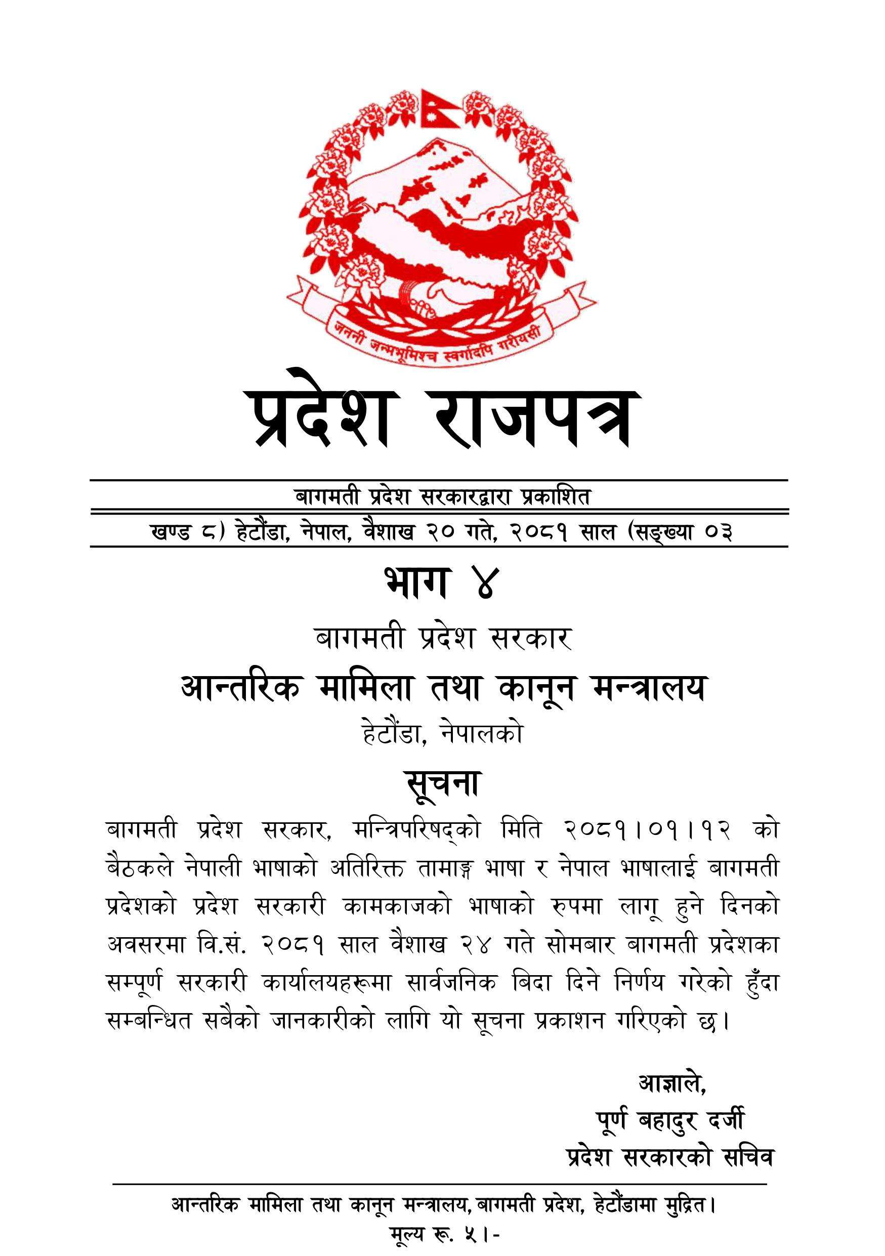 बागमती प्रदेश सरकार, मन्त्रिपरिषद्को मिति २०८१।०१।१२ को बैठकले नेपाली भाषाको अतिरिक्त तामाङ्ग भाषा र नेपाल भाषालाई बागमती प्रदेशको प्रदेश सरकारी कामकाजको भाषाको रुपमा लागू हुने दिनको अवसरमा वि.सं. २०८१ साल वैशाख २४ गते सोमबार ने.सं. ११४४ चौलागा त्रयोदशीको दिन बागमती प्रदेशका सम्पूर्ण सरकारी कार्यालयहरूमा सार्वजनिक बिदा दिने निर्णय गरेको हुँदा सम्बन्धित सबैको जानकारीको लागि यो सूचना प्रकाशन गरिएको छ।
